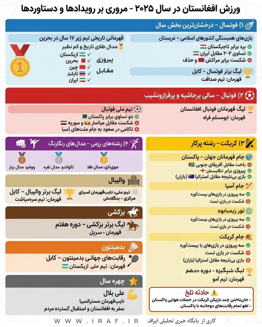 به گزارش ایراف، فوتسال درخشان‌ترین رشته سال بود؛ جایی که تیم زیر ۱۷ سال افغانستان با پیروزی برابر ازبکستان، بحرین، چین، تایلند و ایران، قهرمانی تاریخی خود را در بحرین رقم زد.