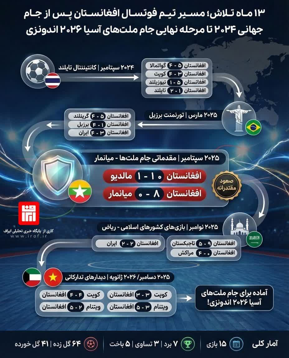 به گزارش ایراف، تیم ملی فوتسال افغانستان که طی سالهای اخیر با عملکردی چشمگیر در سطح بینالمللی مطرح شده، در جام جهانی ۲۰۲۴ یکی از شگفتیسازان بزرگ رقابتها بود و با عبور از مراحل دشوار، حضور تاریخی خود را در جمع ۱۶ تیم برتر جهان ثبت کرد.