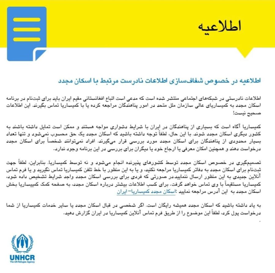 به گزارش ایراف، کمیساریای عالی سازمان ملل متحد در امور پناهندگان (UNHCR) به تازگی با صدور اطلاعیه‌ای اعلام کرد که برخی مطالب منتشرشده در شبکه‌های اجتماعی درباره ضرورت مراجعه یا تماس اتباع افغانستانی مقیم ایران برای ثبت‌نام در برنامه اسکان مجدد، «کاملاً نادرست» است.